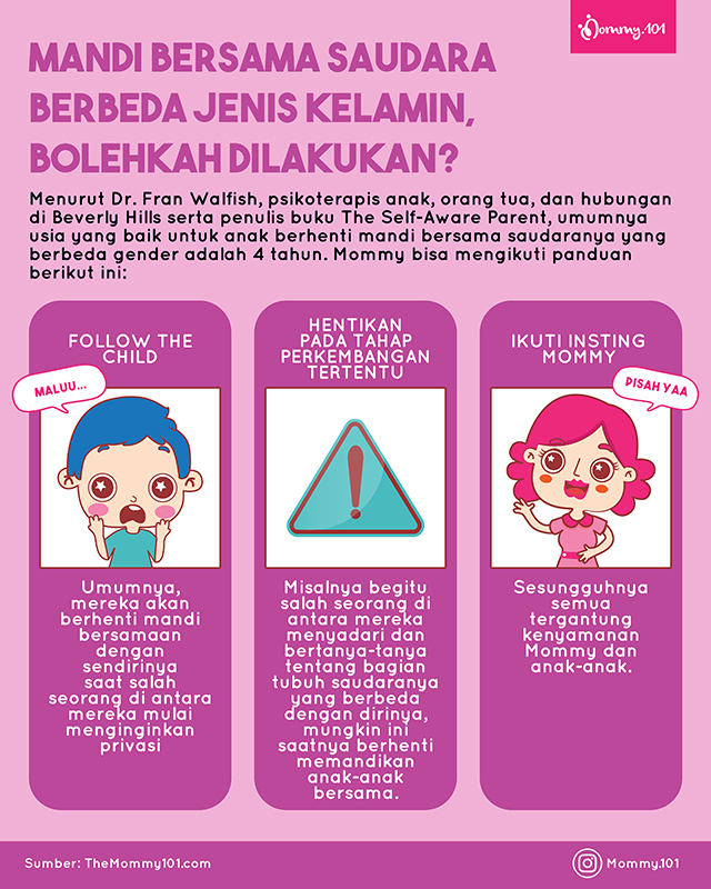 - Sesungguhnya semua tergantung kenyamanan Mommy dan anak-anak. Ada Mommy yang merasa tidak sepatutnya anak berbeda kelamin dibiasakan mandi bersama-sama, tetapi ada juga yang beralasan tidak masalah selama mereka masih kecil. Apa pun itu, sebaiknya ikuti insting Mommy.