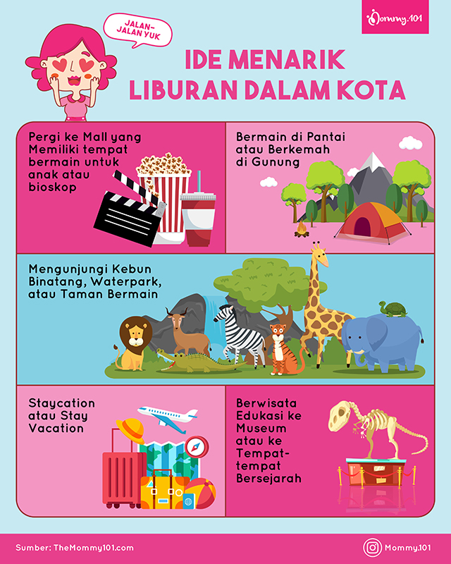 Liburan identik dengan perjalanan jauh, ke luar kota atau ke luar negeri. Padahal, di kota tempat tinggal Mommy pun, mungkin banyak alternatif tempat wisata menarik yang bisa dinikmati oleh seluruh anggota keluarga. Berikut 5 ide liburan di dalam kota yang bisa menjadi inspirasi untuk liburan Mommy bersama keluarga.